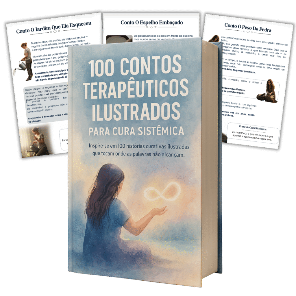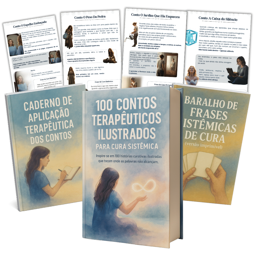 composto por 100 contos terapêuticos ilustrados que já estão transformando sessões de terapeutas, psicólogos, consteladores e profissionais do desenvolvimento humano em todo o Brasil.